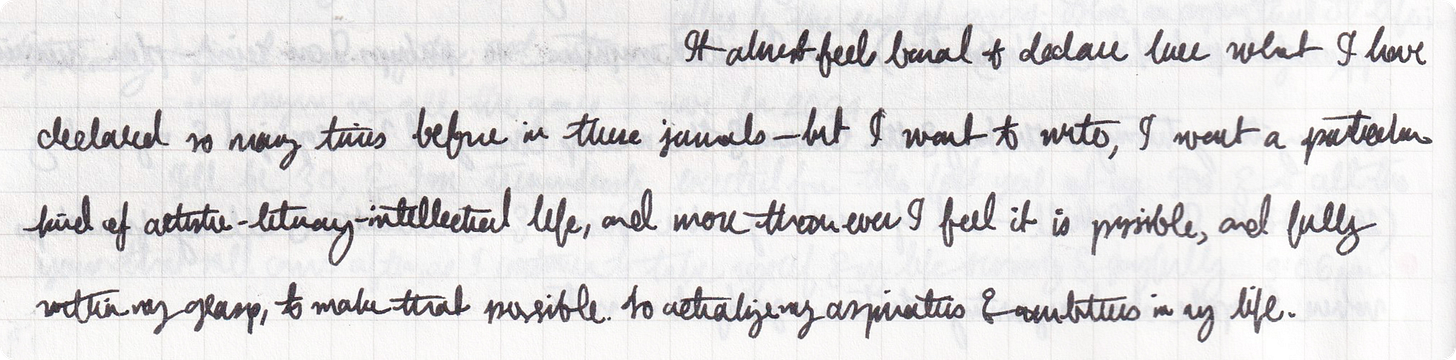 It almost feels banal to declare here what I have declared so many times before…but I want to write, I want a particular kind of artistic–literary–intellectual life, and more than ever I feel it is possible, and fully within my grasp, to make that possible.