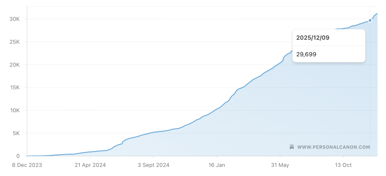 It was an unexpected and deeply gratifying way to celebrate two years of writing personal canon. And in a year where writers are justifiably distressed by the dawn of a post-literate society, a brain rot without borders, and ChatGPT-induced cognitive decline, the success of this newsletter seems especially improbable. Concretely: I write a newsletter about literary criticism with over 30,000 readers, who have chosen to receive 4,000 to 10,000–word emails discussing books by independent presses (including Fitzcarraldo, New Directions, NYRB Classics, And Other Stories) and university presses (including MIT Press and Yale University Press), alongside literary fiction and nonfiction from Big 5 publishers.